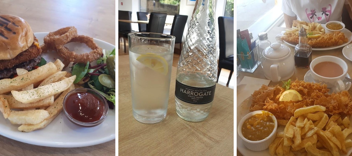 In addition to classic fish and chips, The Wharfe features side dishes like mushy peas and curry sauce, as well as items like burgers, sausages, and even light snacks like prawn cocktails.